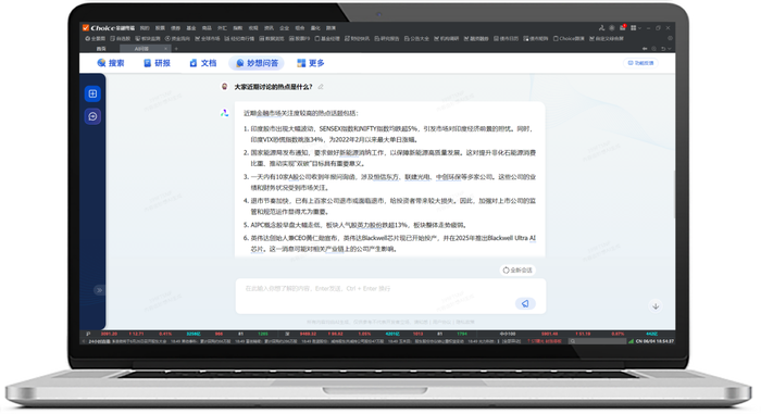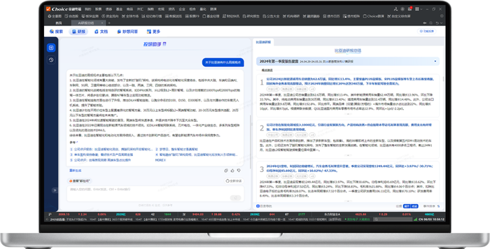 Choice智能金融终端AI搜索在理解用户搜索意图的基础上,智能挖掘和优选相关资讯、研报、公告等内容,并根据用户问题归纳总结成多维度、有条理的完整回答结果及要点提炼。